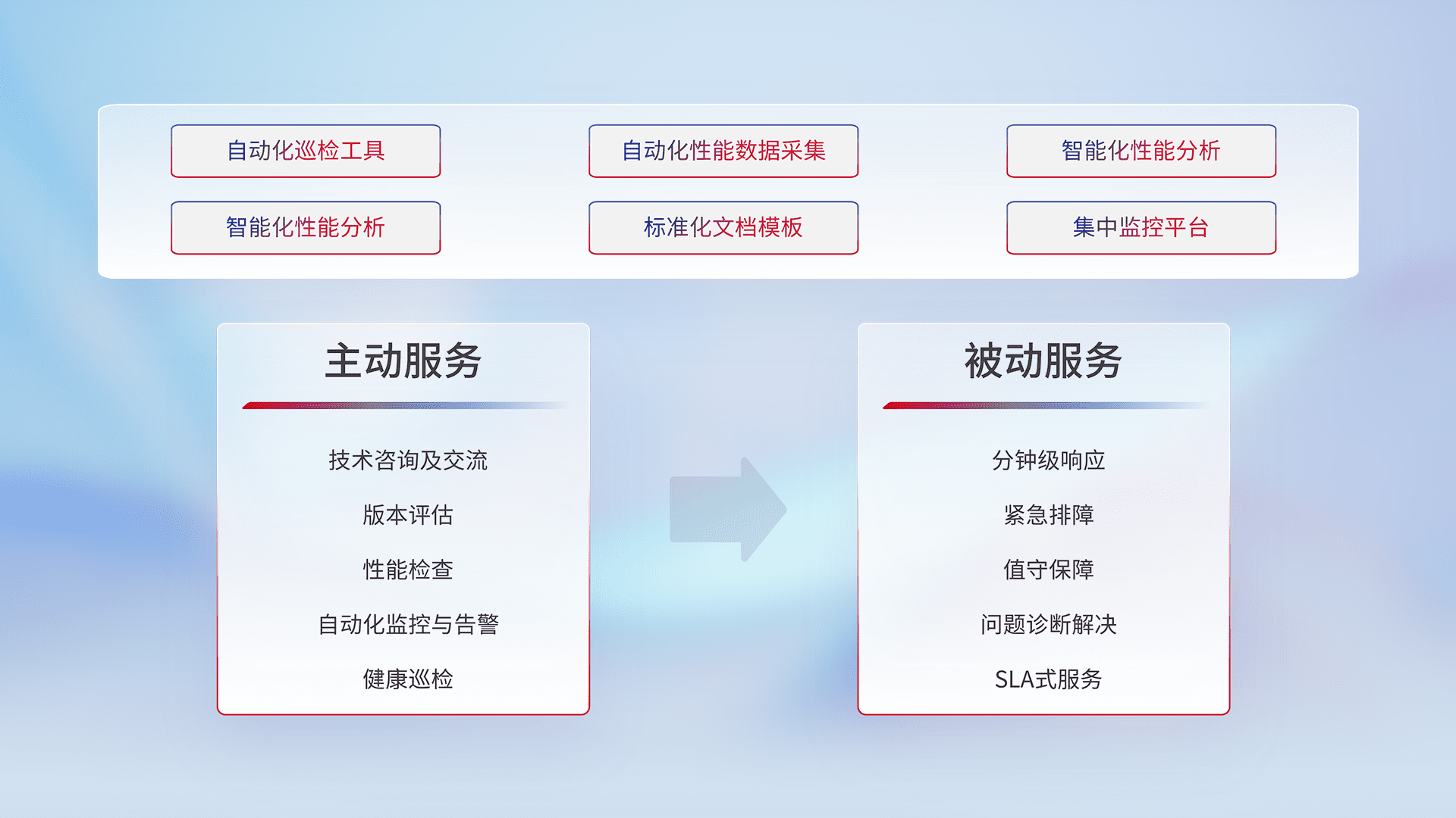 智能化工具和标准化文档,,,,保障服务质量,,,,提供主动服务(包含技术咨询、、、、版本评估、、、、性能检查、、、、自动化监控与告警、、、健康巡检)和被动服务包含(分钟级响应、、、紧急排障、、、值守保障、、、、问题诊断解决、、SLA服务)。。